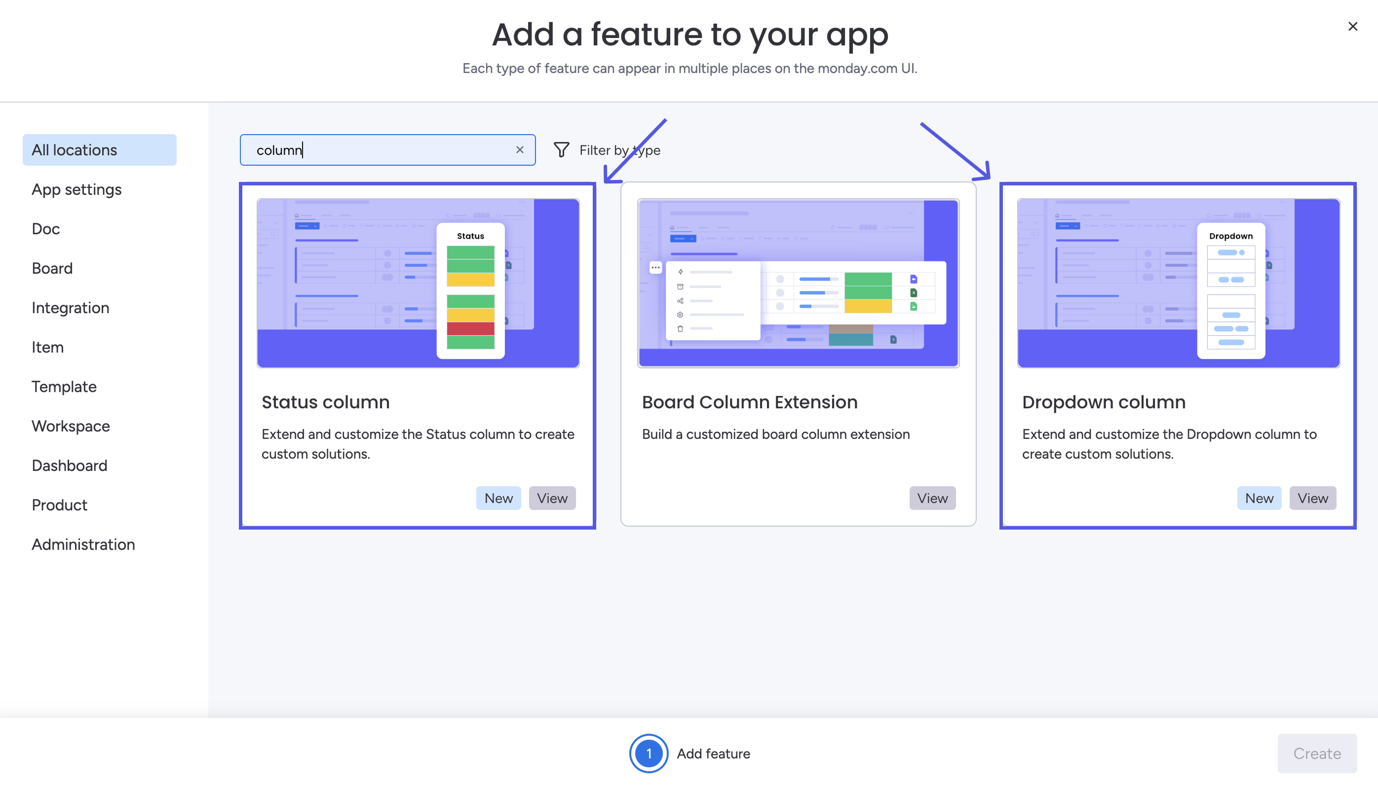 - Board columns: The core component that powers monday.com's column functionality and stores related information (currently supports status and dropdown columns).