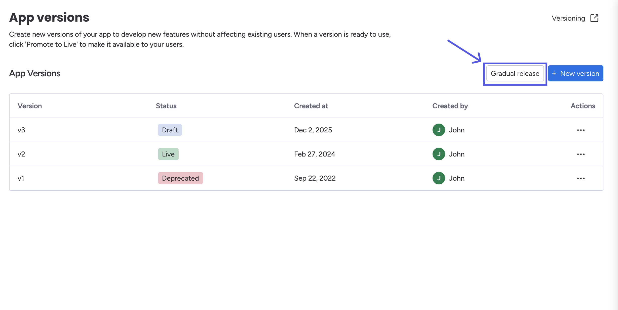 Once a gradual release is published, the version will be in Gradual release status in the Versions tab. You can then edit the audience and features, roll it back to draft status, or promote that version to live: