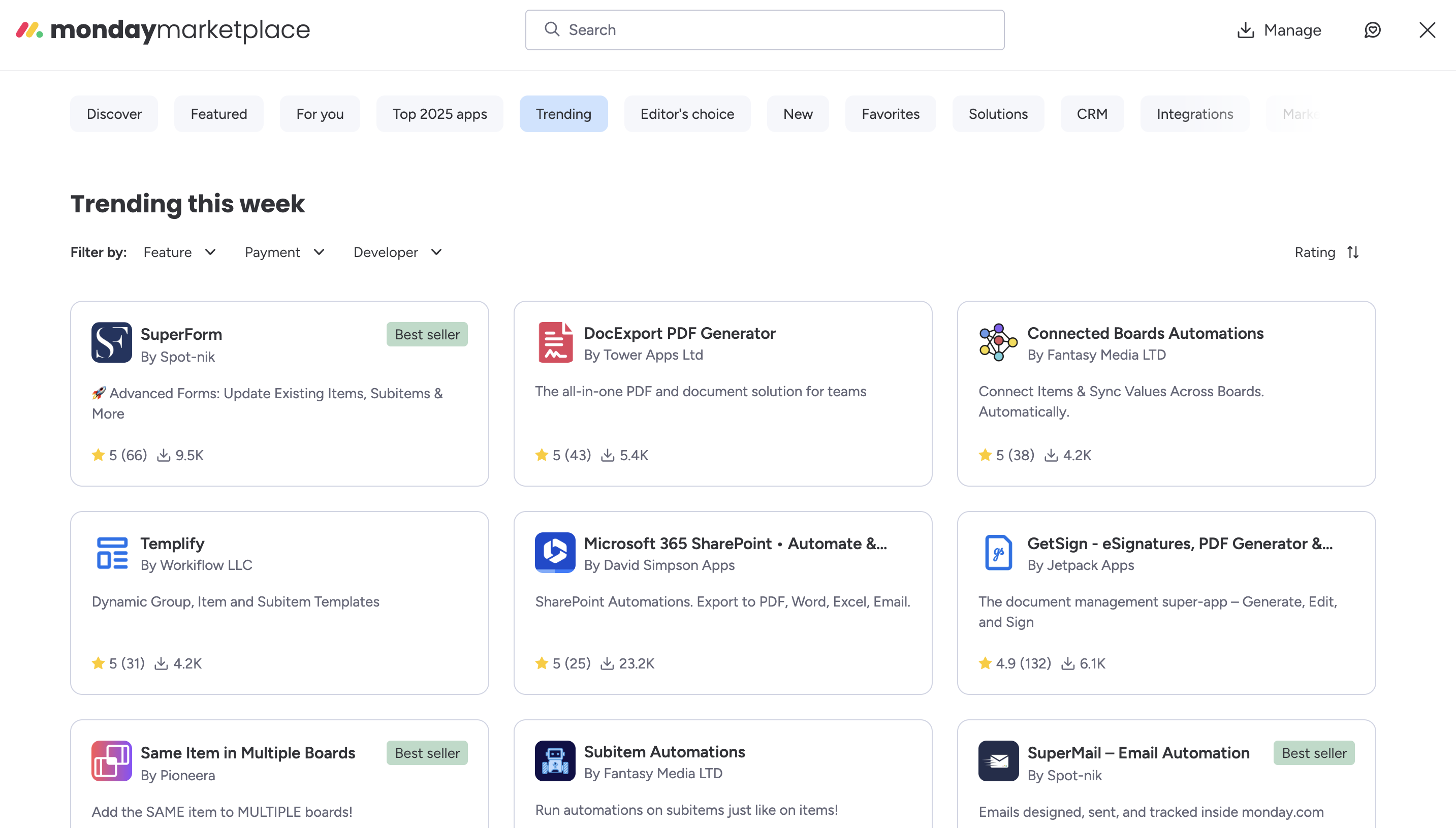 The Recommended for You section tailors suggestions to users based on their account’s behavior cluster, which is assigned based on responses to questions submitted while registering for monday.com. Apps that earn app card labels (covered below) are featured in relevant sections like Best Sellers and Editor's Choice.