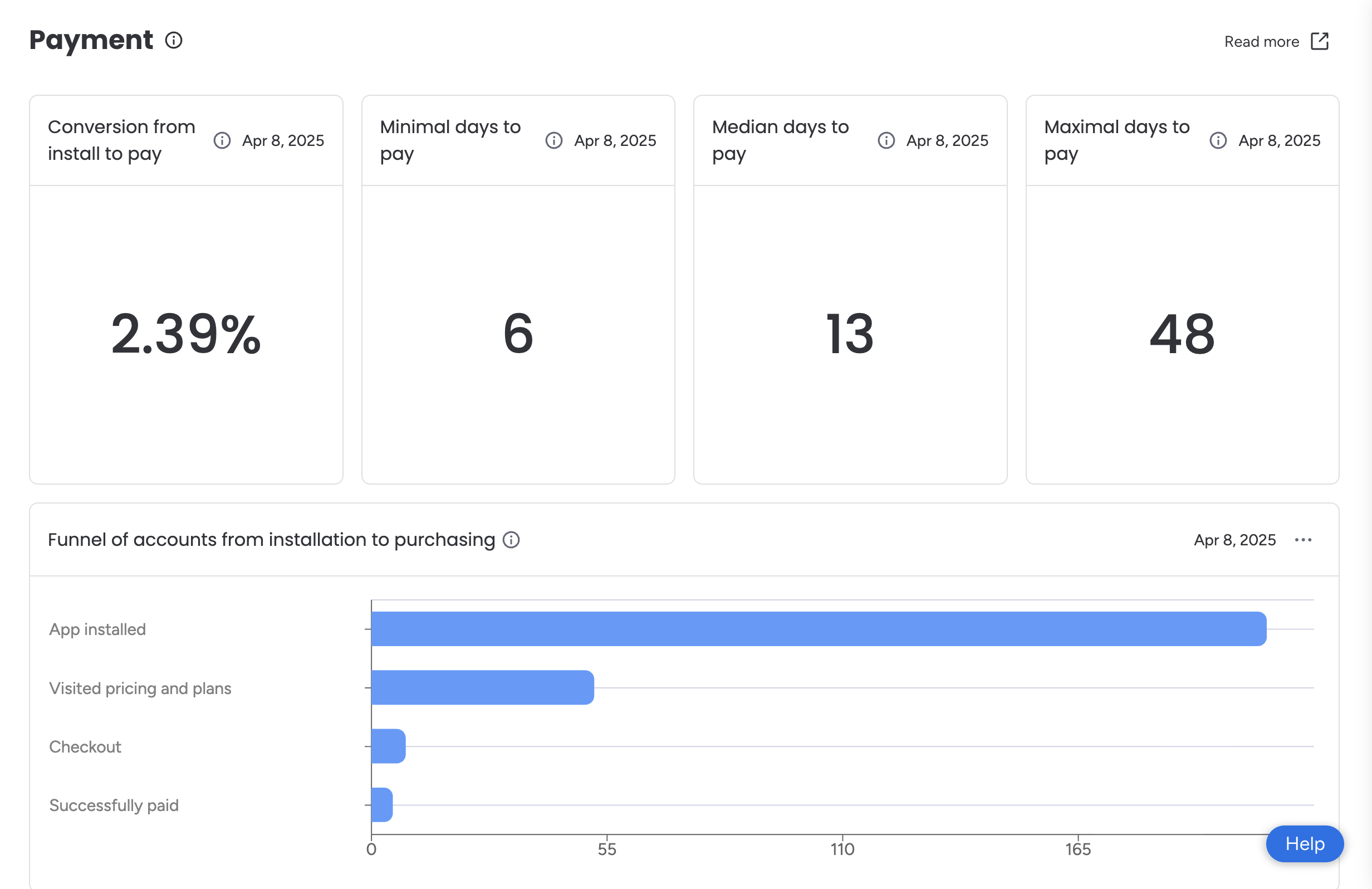 The Payment tab in the Developer Center tracks key metrics related to your app's monetization, including install-to-purchase funnels and conversion timelines.